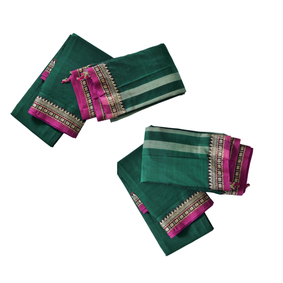 This cotton dress set features a rich green base paired with a beautifully designed contrast border in vibrant tones, creating a graceful ethnic look ๐.