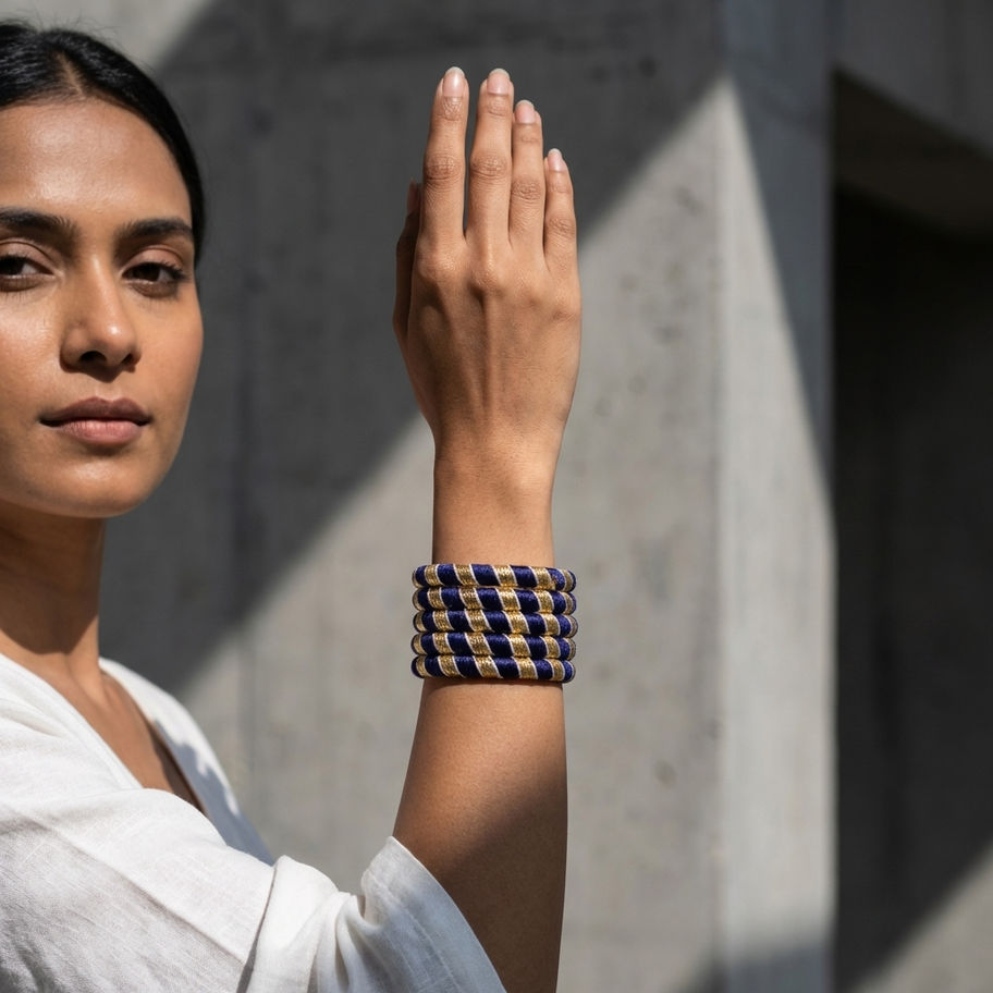 This Gota Patti Kids Bangles Set (4 pieces) is specially designed for little hands, featuring a beautiful combination of deep blue thread and shimmering gold gota detailing 💛